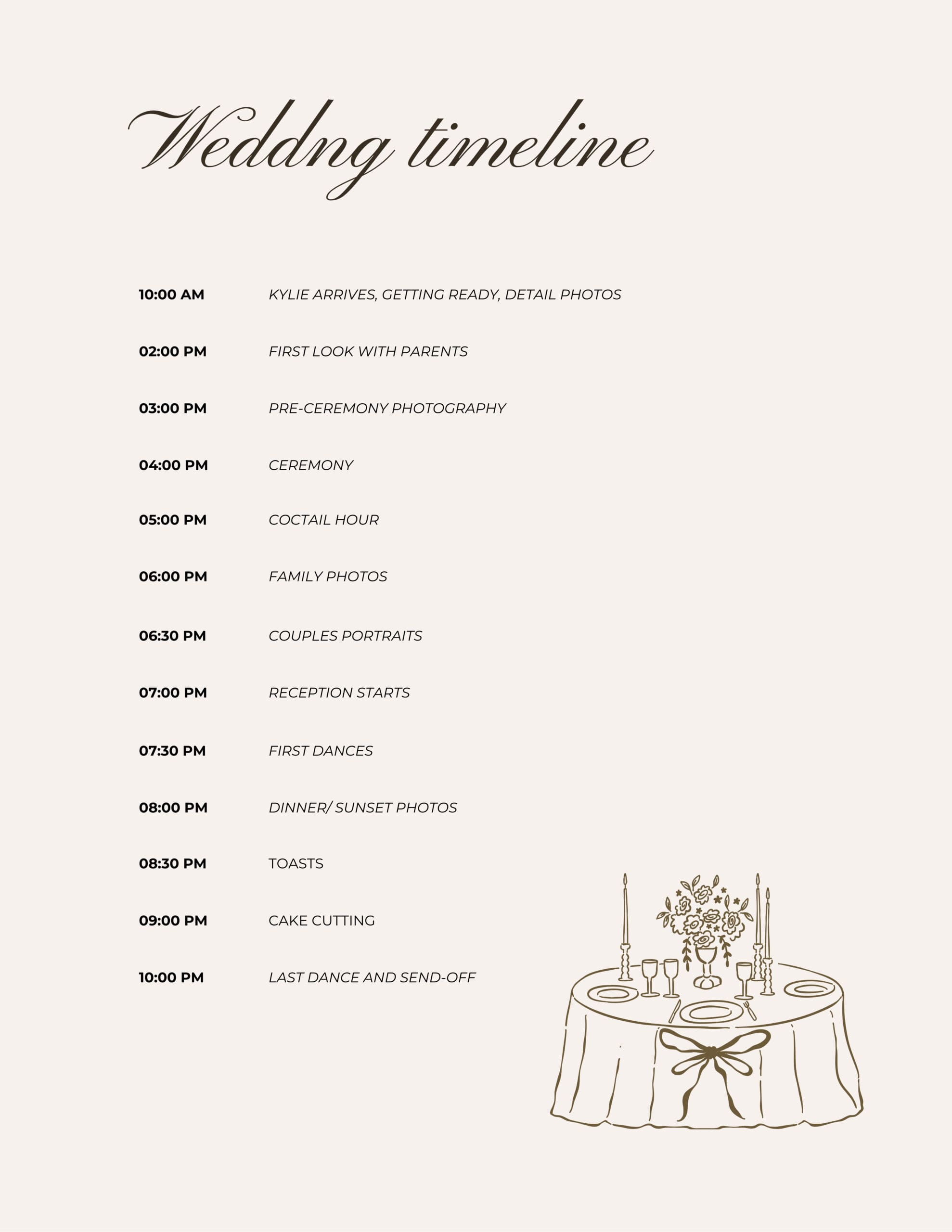 Hair and makeup often run late — add at least 30 extra minutes to this portion so you don’t feel rushed before your first look or ceremony.
